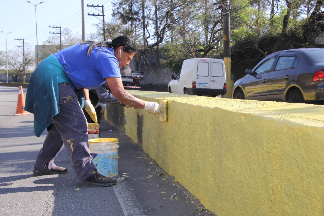 Equipes da zeladoria estão efetuando a pintura do muro com tinta amarela. O objetivo da intervenção é reforçar a sinalização do item de segurança, fazendo com que o motorista e o pedestre visualizem a proteção.