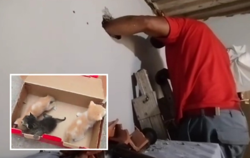 O bombeiro fez um furo na parede e conseguiu retirar com segurança os três filhotes. “Eles já estavam bem debilitados, um deles não conseguia nem miar de tão fraco que estava. Certamente se passasse mais alguns dias poderiam ter morrido”, conta.