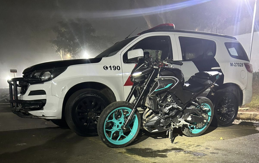 Após tentarem evitar a abordagem inicial, com apoio de outras viaturas, foi possível interceptar os suspeitos. Em consulta, constatou-se que a motocicleta Yamaha MT-03 era produto de roubo.
