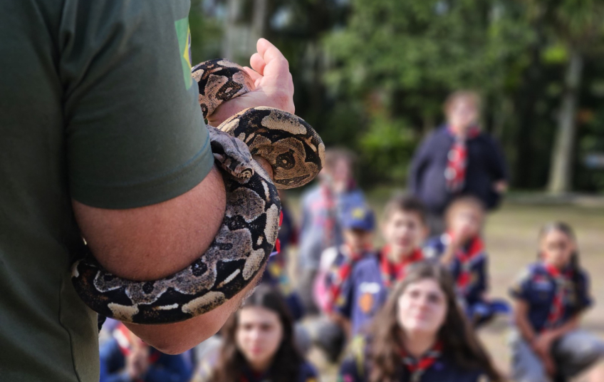 No primeiro momento, os pequenos escoteiros tiveram a oportunidade de conhecer de perto animais silvestres da fauna local, como uma serpente da espécie jiboia. A interação foi acompanhada por educadores ambientais e garantindo que todas as normas de segurança e bem-estar animal fossem seguidas.