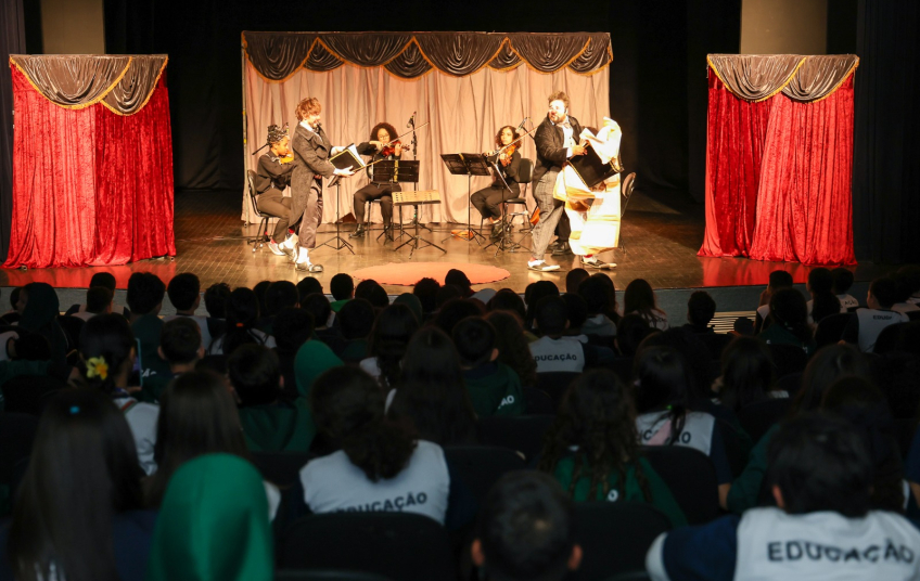 O dia foi dividido em dois momentos: pela manhã, 252 alunos assistiram à primeira apresentação, enquanto, no período da tarde, 256 estudantes ocuparam o teatro para a segunda sessão. Com entrada gratuita e classificação livre, o espetáculo une música e humor para apresentar de forma lúdica o universo dos instrumentos de um quarteto de cordas, conduzido por dois palhaços maestros que disputam de maneira divertida o posto de regente principal.