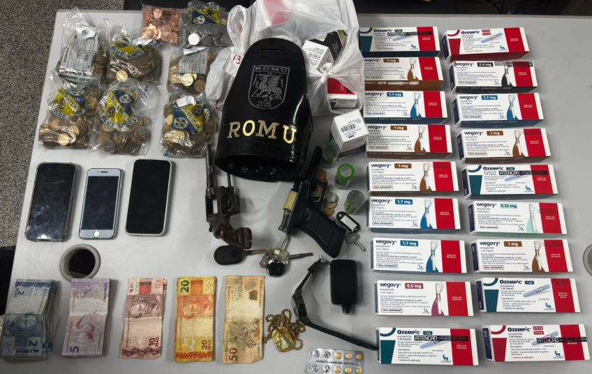 Durante a busca veicular, os GCMs localizaram um revólver calibre 32, uma arma de fogo similar a uma pistola, celulares, uma quantia em dinheiro e uma grande quantidade de medicamentos. O veículo possuía registro de furto e estava com placas de outro automóvel, sem queixa de crime, com o intuito de burlar o sistema de videomonitoramento.
