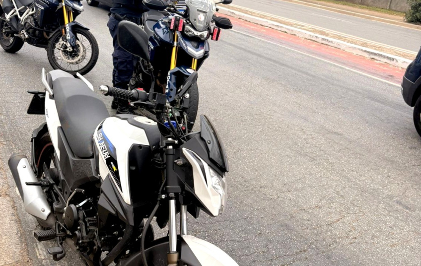 Na busca pessoal, nada de ilícito foi encontrado. Entretanto, em vistoria à motocicleta, a equipe constatou adulteração em um dos elementos identificadores: a letra “L” havia sido modificada para a letra “U” com o uso de fita isolante. Além disso, foi verificado que o condutor não possuía CNH (Carteira Nacional de Habilitação).