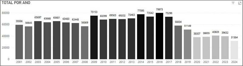 Foram registrados 31.584 roubos — que incluem de carga e a banco — entre janeiro e novembro em todo o interior paulista. Esse é o menor número desde 2001. Em comparação a 2023, os casos de roubos diminuíram em 26,9%. Em novembro, a queda nesses crimes chegou a 25,7% no interior.