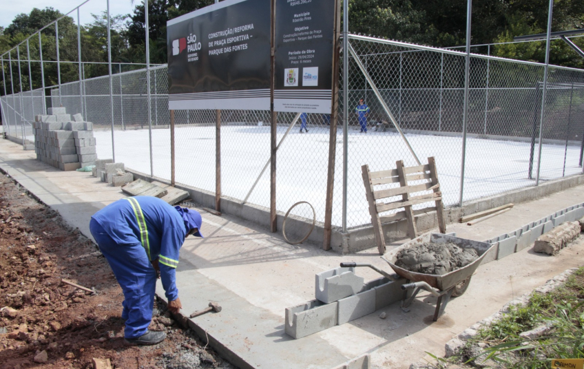 A Prefeitura de Ribeirão Pires, por meio da Secretaria de Obras, dá andamento à construção da Praça Esportiva do Parque das Fontes, localizada à Rua Paraíba, s/nº. Com equipes trabalhando no local, já estão preparando o piso das quadras, a pintura do alambrado, execução dos passeios e reboco das canaletas.