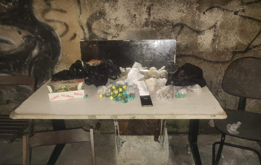 Os agentes foram acionados para atender a uma ocorrência de perturbação de sossego e, ao chegarem ao local, encontraram três suspeitos próximos a uma mesa com diversas porções de drogas. Um deles fugiu e não foi localizado. Os outros dois foram detidos no local.