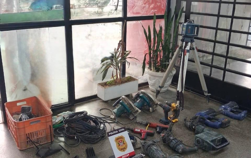 furadeiras, marteletes e equipamentos de demolição, parafusadeiras, serras circulares e discos de corte, nivel a laser, mandril, brocas e demais acessórios, bloqueador de sinal portátil, roteador e ferramentas diversas, além de uma pistola calibre .380 municiada