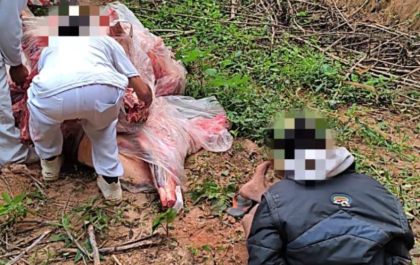 Com base nas informações, uma equipe se deslocou até a Avenida Joaquim Napoleão Machado, local conhecido por ocorrências de transbordo de carga roubada. Durante incursão em uma área de invasão, os policiais avistaram um caminhão branco sendo descarregado por indivíduos que manipulavam peças de carne bovina no chão.