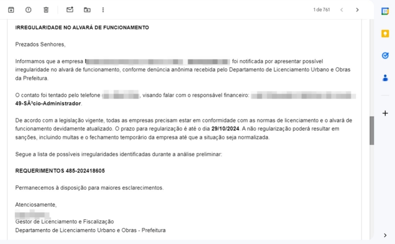 Santo André, 31 de outubro de 2024 – A Prefeitura de Santo André por meio da Secretaria de Planejamento Estratégico e Licenciamento informa que e-mails fraudulentos têm circulado, alegando irregularidades em alvarás e solicitando a regularização dos mesmos com urgência. Esclarecemos que esses e-mails são falsos e que a Prefeitura não entra em contato com os munícipes solicitando a regularização de alvarás vencidos.