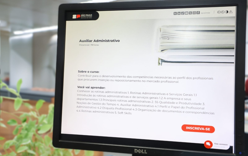 O curso de auxiliar administrativo tem carga horária de 78 horas, período em que o aluno vai receber informações sobre as rotinas administrativas; a organização da empresa e seus departamentos; sobre qualidade e produtividade; gestão do tempo; o perfil e o papel do profissional administrativo; etiqueta profissional; organização de documentos e correspondências e soft skills (conjunto de competências sociais, emocionais e mentais que influenciam o comportamento de pessoa, especialmente no ambiente de trabalho). O acesso direto para inscrições é https://www.alunos.cettpro.sp.gov.br/meu-primeiro-emprego/cursos/40740626-352f-f011-8c4e-000d3ac13d30.