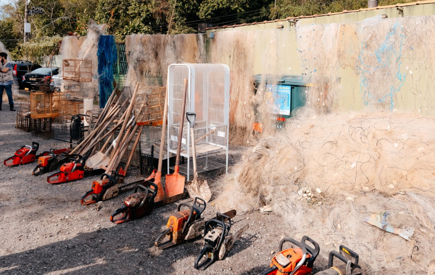 Trator descaracterizou cerca de 30 gaiolas e armadilhas para pequenos animais e pássaros e nove motosserras, além de dois barcos inservíveis; atividade integra o Junho Verde