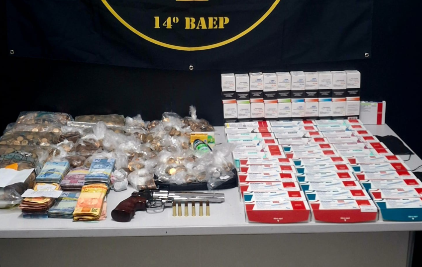A equipe conseguiu recuperar R$ 7 mil em espécie, além de 55 medicamentos avaliados em mais de R$ 183 mil. Um simulacro de revólver também foi apreendido.