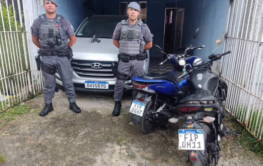 Durante patrulhamento pelo bairro Recanto Campo Belo, policiais do 27º Batalhão de Polícia Militar Metropolitano localizaram três veículos suspeitos dentro de uma garagem: uma Tucson, uma motocicleta PCX150 e uma Kawasaki.