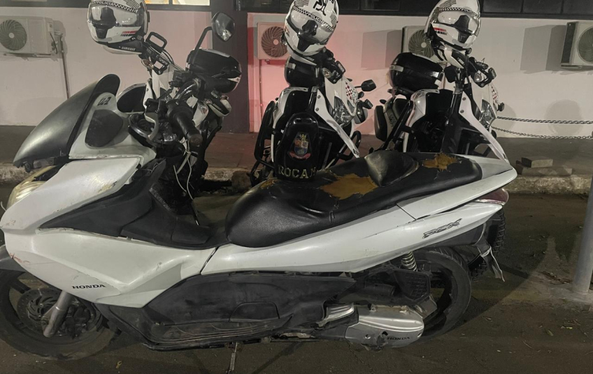 Realizada a abordagem, nada de ilícito foi encontrado em posse do indivíduo. Contudo, em consulta veicular via Centro de Operações da Polícia Militar (COPOM), o emplacamento informado retornou pertencente a outra motocicleta, modelo Honda ADV 150, que constava com histórico de fuga de viatura em setembro de 2023, ocasião em que foi utilizada uma Honda CG 160.