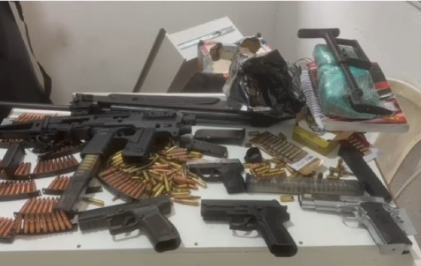 Na chegada da polícia, o detido foi flagrado portando uma pistola. No imóvel ao lado, foram encontradas porções de skunk e alguns armamentos, como quatro pistolas, uma carabina, uma submetralhadora e uma espingarda. Munições de fuzil e de diversos calibres também foram apreendidas.